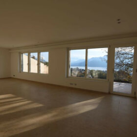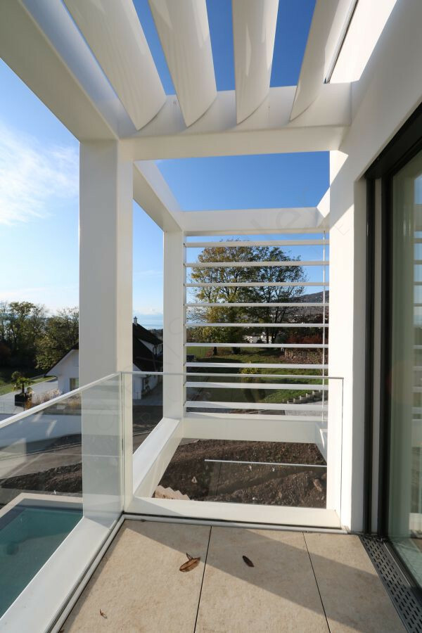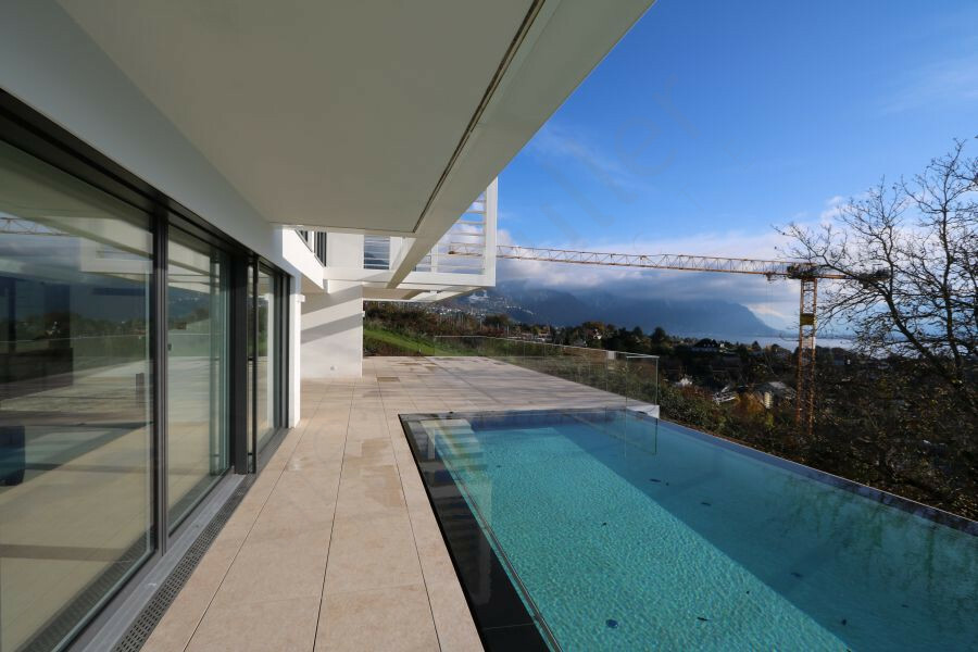 La villa a été implantée en amont de la parcelle afin de tirer le meilleur parti de la vue panoramique sur le lac et les alpes.