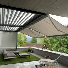 Les stores-banne qui avaient été posés sur la façade du bâtiment ont été reposés sur la structure de la pergola.